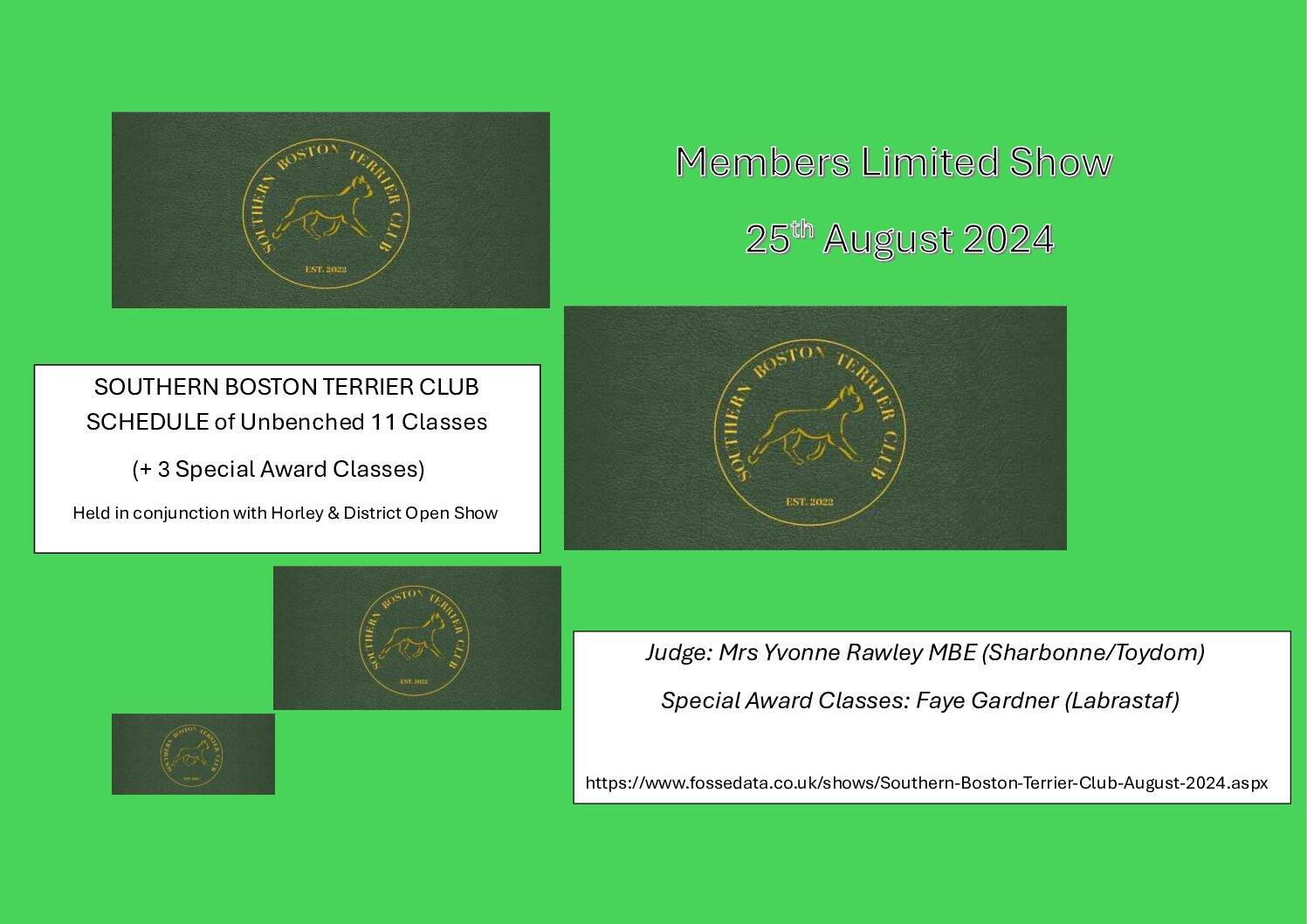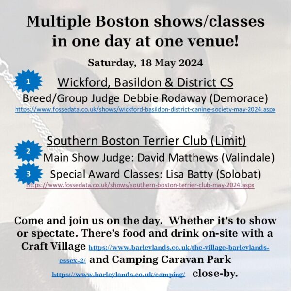 - 21/04/2024 – SBTC Supported entry show Boston Terrier breed classes judge Arian Bedford